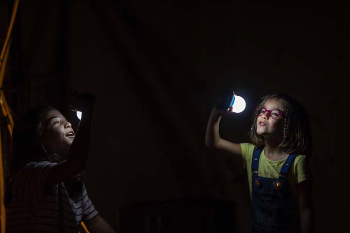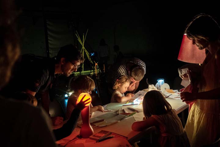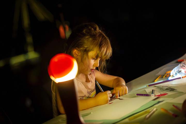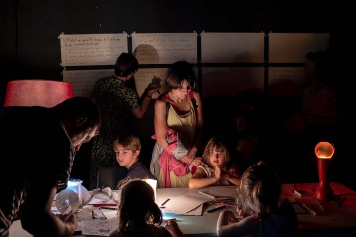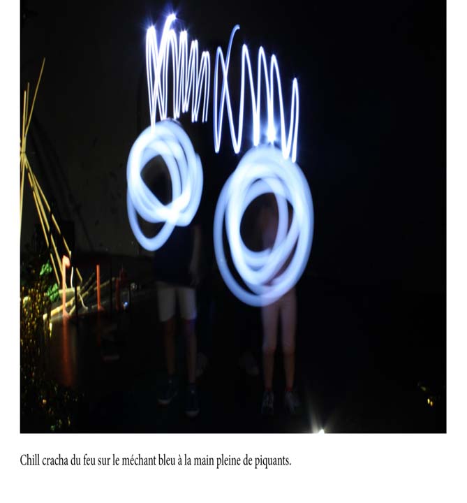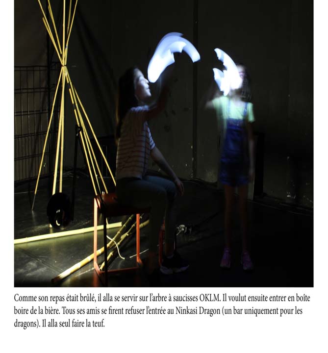 Une pièce noire, quelques lampes chaudes pour trouver son chemin. Aux murs, de grandes feuilles de papier où inscrire l’histoire chaque fois augmentée et poursuivie du récit d’un nouvel enfant. A côté, une table où dessiner la suite de l’histoire en couleurs avant que je la transforme en mots et l’inscrive sur le mur. Une marionnette de Chill le dragon, personnage principal de l’épopée, pour inspirer les enfants et raconter avec moi l’histoire en cours aux nouveaux arrivants. Un carnet mystérieux pour que les parents notent leurs adressent mail et puissent recevoir plus tard l’histoire complète. De l’autre côté de la salle, la dernière étape, un espace habité d’objets étranges pour illustrer en light painting le morceau d’histoire que l’enfant vient d’inventer. Au final, de magnifiques dessins d’enfant, une histoire complète et des photos pour l’illustrer. De quoi revivre l’expérience et découvrir l’univers au complet une fois rentré chez soi.