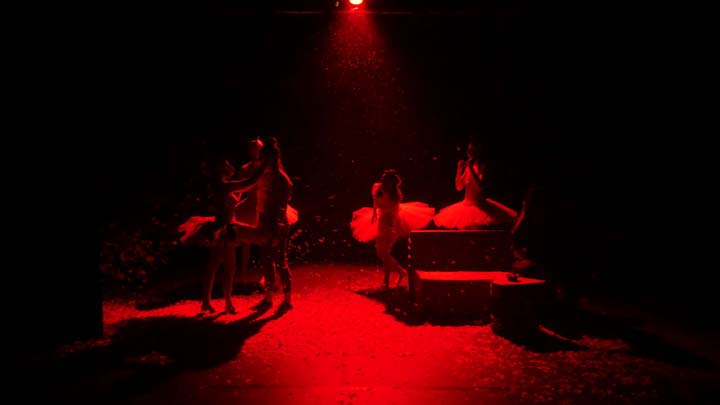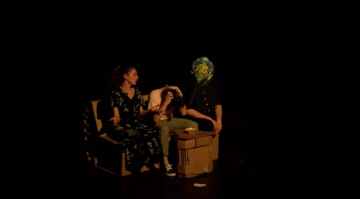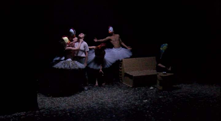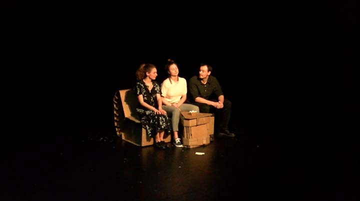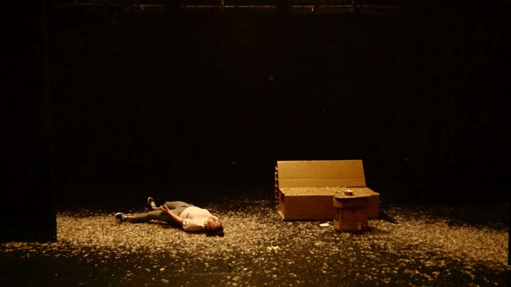 L’espace est habillé d’un noir opaque qui, tout en angoissant le spectateur qui perd ses repères, le projette dans un monde sans limite dont les habitants surgissent de l’ombre avant d’y retourner. L’histoire se concentre autour des perceptions directes de Dominique. L’espace de pendrions noirs sur patiences est actionné à vu par tout autre personne que Dominique qui ne peut qu’assister aux scènes qui s’enchaînent rapidement comme immobile et victime de flash back permanents. Les éléments de décor sont entièrement en carton, matière de l’ordre du monde industriel évocatrice de l’usine dans laquelle Dominique travail. Ce mobilier qui convoque l’ennuie par son manque de variété et son esthétique unique est pauvre à l’image des pensées qui habitent Dominique. Il crée aussi un contraste déréalisant comme si ce monde au plateau allait s’effondrer à tout instant et plier sous le poids des comédiens quand il continue à résister, imperturbable. Le mobilier accueil les « Blast » de poulets qui ont lieu, prêtant leur surface lisse de carton aux variations forte des lumières. Ils se fondent entièrement dans le halo coloré. Le mobilier en carton permet aussi les changements de plateau rapides et silencieux nécessités par la mise en scène.