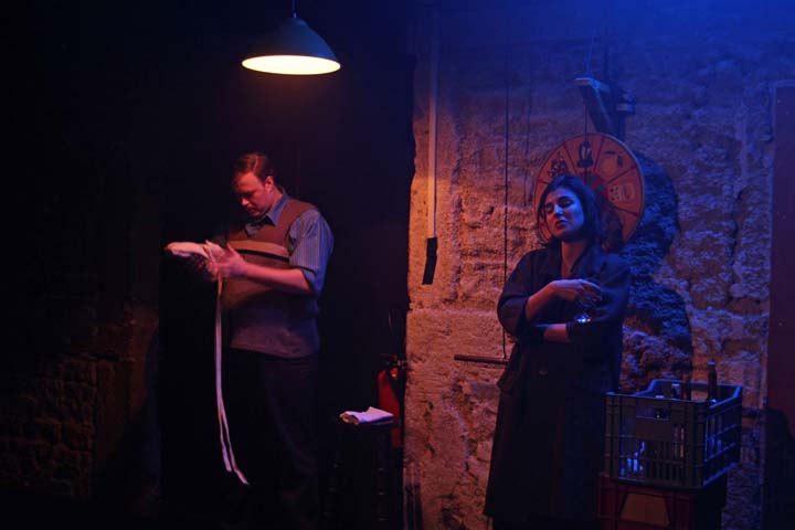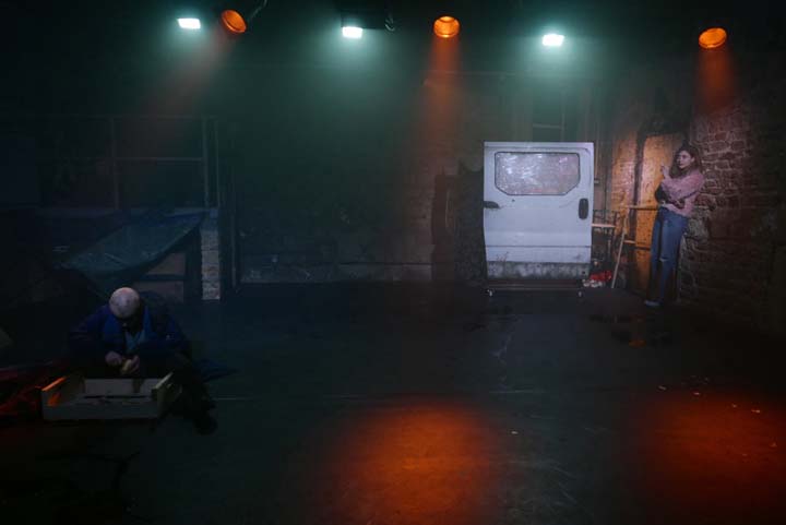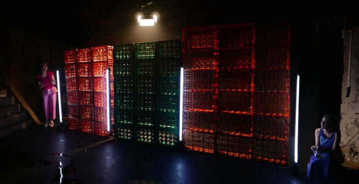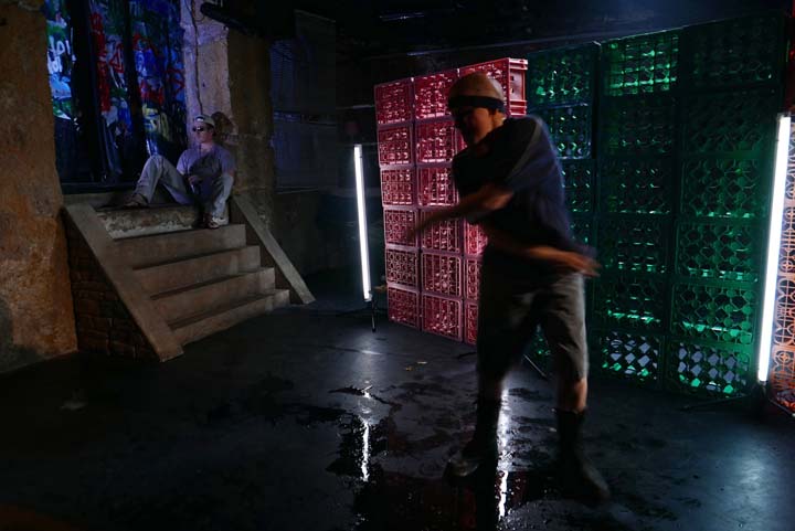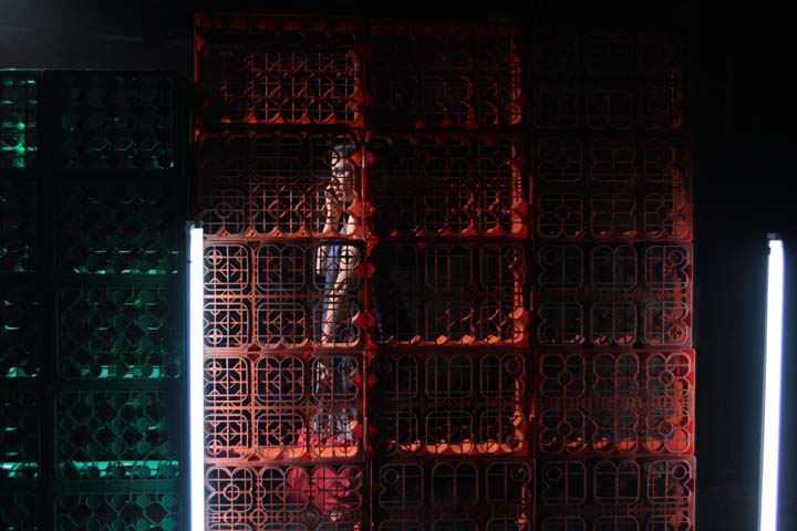 L’espace s’inspire tout d’abord de vieilles pierres du Théâtre des Clochards Célestes pour se fondre dans l’histoire de la ville de Lyon à travers ses murs porteurs. Ce sont ses vieilles pierres jaunes traditionnelles qui constituent la base de mon décor. L’espace est ensuite envahi par des cagettes aux couleurs prononcées qui viennent à la fois cacher l’ancienne architecture et créer une frontière abrupte et contemporaine juste aux pieds des spectateurs. L’on passe ainsi de l’ancien quartier de Confluences à sa version moderne et des- humanisée.
