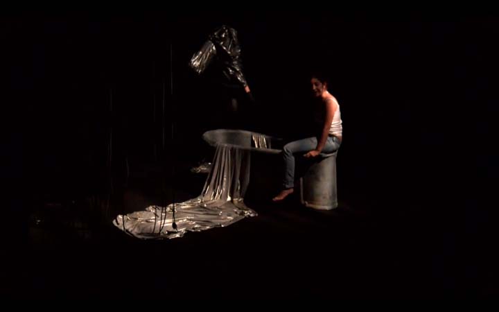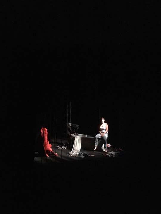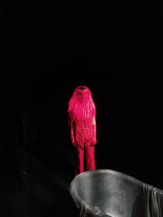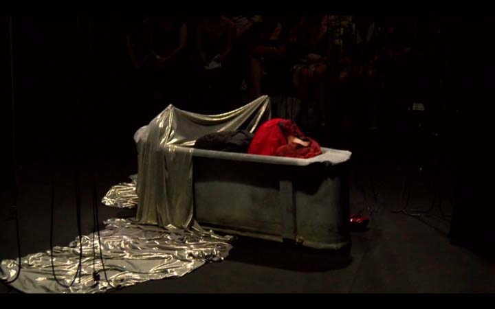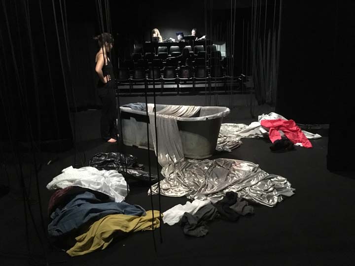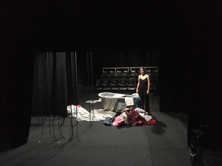 Le plateau est un bi-frontal. Comme les créatures du plateau sont les reflets décomposés des monstres intérieurs d’Hélène qui habite la baignoire (à moins qu'elle soit juste en train de prendre simplement son bain dans une ébauche d’espace ménager?), le public se voit lui-même comme en miroir. L’espace central de la scène est d'un noir profond habité par les nuances de sombre proposées par la lumières. L’espace est mental et intime, on ne le distingue que dans son fort intérieur, comme les restes d'un rêve à la limite du réel. Des frises très basses viennent finir de resserrer l’espace et lui conférer comme l’aspect d’une vignette de cinéma. L’oppression subie par Hélène est tangible et la scène au plateau à la fois proche et lointaine pour le spectateur. C'est un espace d’où naît l’étrange et où rien n’est net comme l’effet produit par des innombrables fils noirs qui pendent des cintres comme des tentacules et rendent l’espace pour moitié illisible, fragmenté. L’espace est en désordre et le langage confus, tourmenté. Les matières s’entassent et prennent vie pour devenir des monstres vêtus du désordre d’Hélène. L’eau fluide et scintillante n’est pas mouillée et fait naître le basculement; l’irréel et le rêve.
