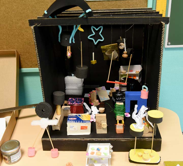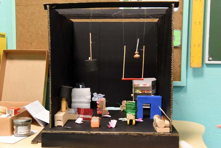 L'atelier s'inspire du principe du "cadavre exquis". Chaque participant.e pioche en arrivant un papier dans 4 boîtes différentes correspondant chacune à une caractéristique d'un objet (sa couleur/sa taille/son matériau/ la manière dont les comédien.ne.s vont l'utiliser au plateau). A partir de là, il faudra dessiner un objet qu'on pense correspondre aux caractéristiques piochées, puis faire de son dessin un modèle réduit en volume qu'on viendra ensuite placer dans une maquette de boîte noire commune. Au fur et à mesure de l'atelier la maquette s'enrichit de toutes les créations des participant.e.s pour créer un espace original et unique. On en discute ensuite pour voir quels imaginaires on peut y projeter.