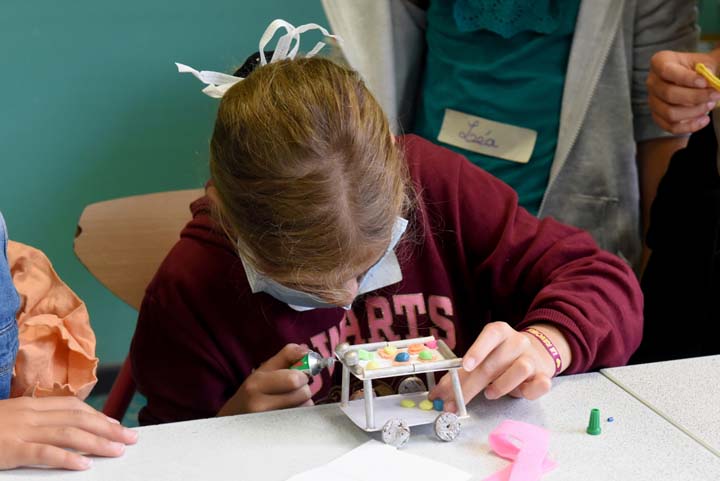 L’idée de démarrer l’atelier en piochant 4 contraintes qui guident ensuite la création s’appuie sur l’idée que c’est parfois la rencontre avec un matériaux ou un objet qui nous inspire une idée de décor et non forcément le matériaux qui doit se plier à notre idée. L’objet